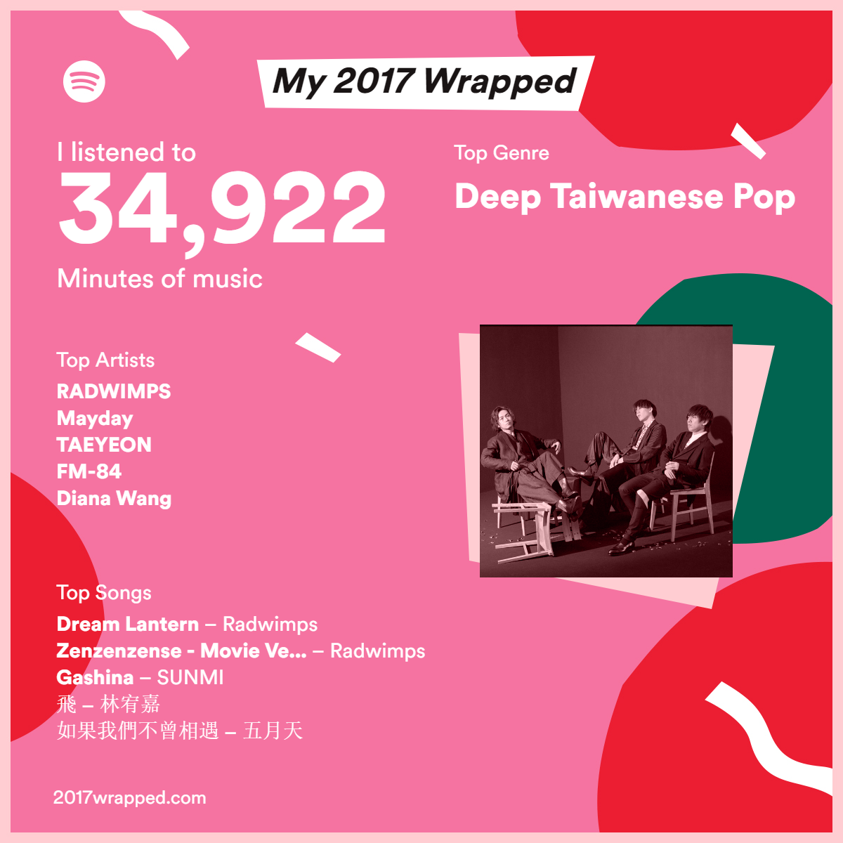 Compared to 2016, I doubled the number of minutes I listened to music on Spotify, probably because I finally got Spotify Premium. Overall, it seems that I shifted from kpop to more Mandarin-language music. Last year, all four of my top tracks were kpop, but only one was this year. As for top artists, Taeyeon remains (love her!) but no one else. I'm still trying to figure out what exactly deep Taiwanese pop is, but it's probably safe to assume it means Mayday even though I thought that they were supposed to be more of a rock band.